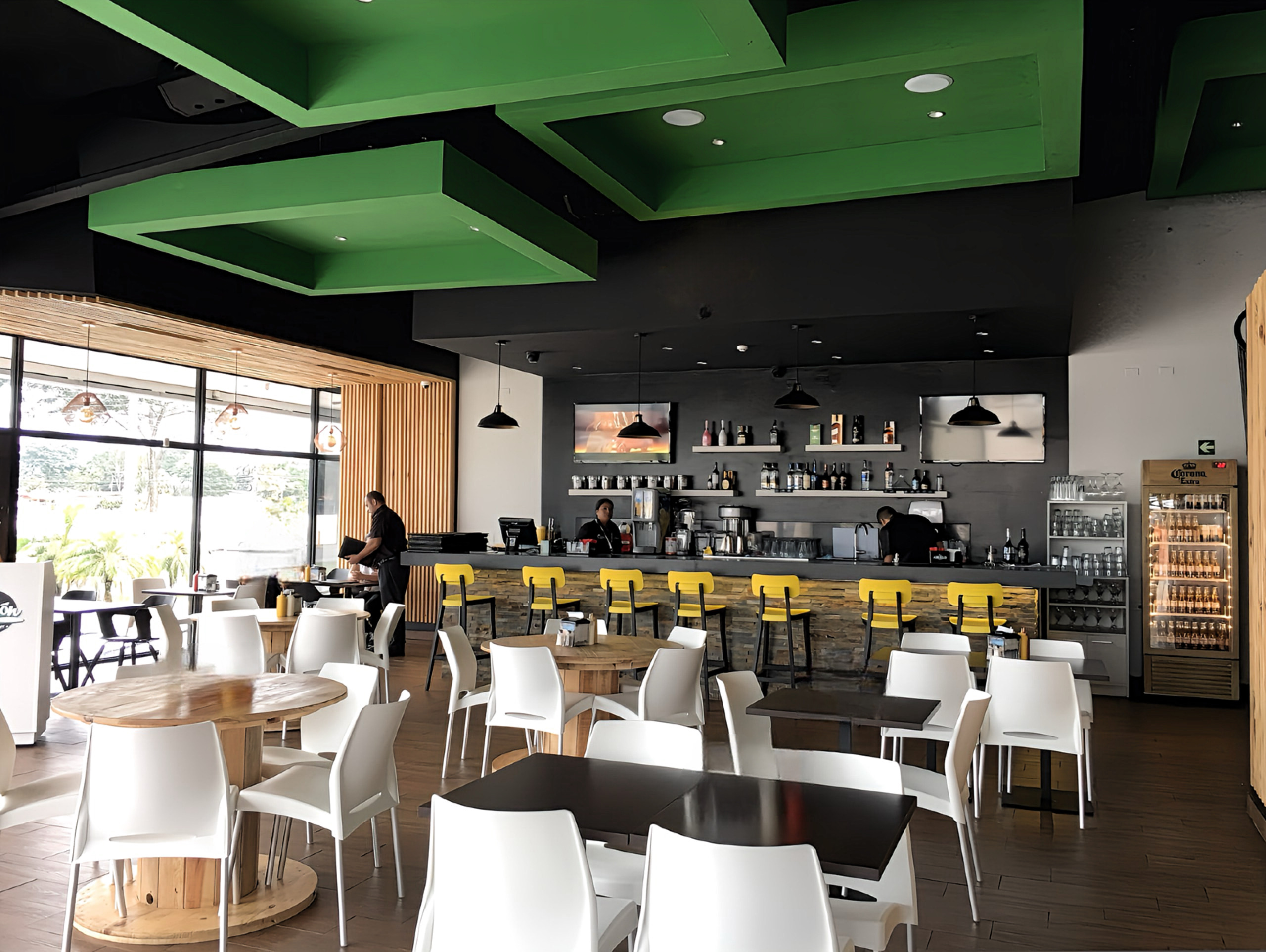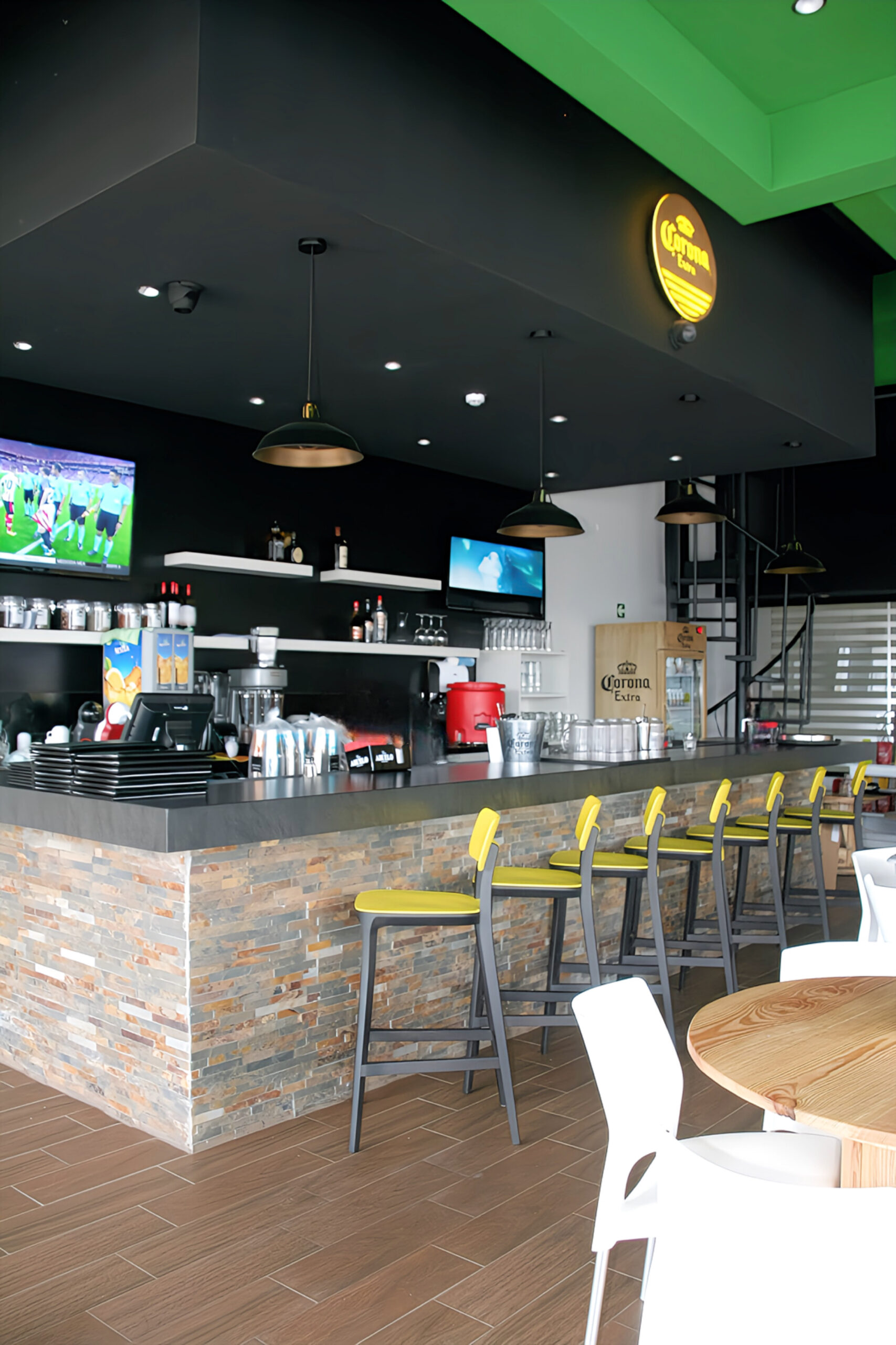 Se buscó un diseño industrial con un toque rústico, sin perder el estilo desenfadado que caracteriza el resto de los establecimientos. Algunos elementos clave, como el falso techo de cubos verdes (que se actualizó con un rediseño), el mobiliario principal y una imagen representativa de Chiriquí fueron requisitos de la marca. Más allá de estas directrices, los socios del local nos dieron carta blanca al diseño, involucrándose desde el inicio y mostrando gran entusiasmo con las propuestas planteadas.